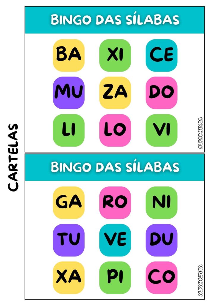– 22 cartelas com 9 sílabas cada uma (Entregar uma cartela para cada aluno. Você poderá distribuir feijões, tampinhas ou outro objeto para que cada aluno marque em sua cartela, as sílabas sorteadas. Ganha quem completar a cartela primeiro).
