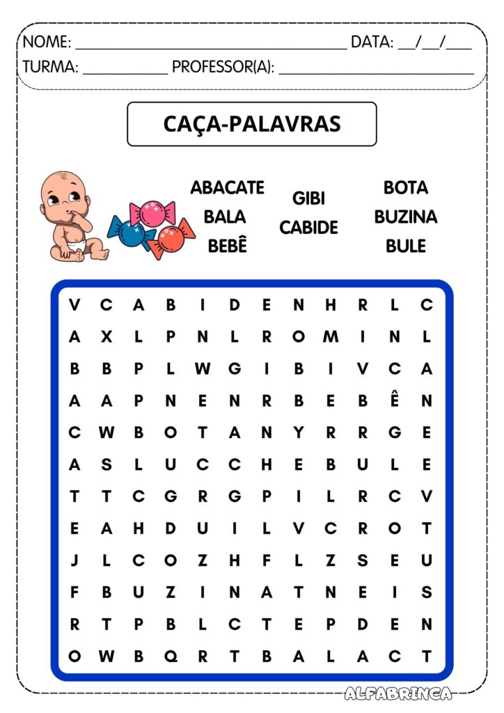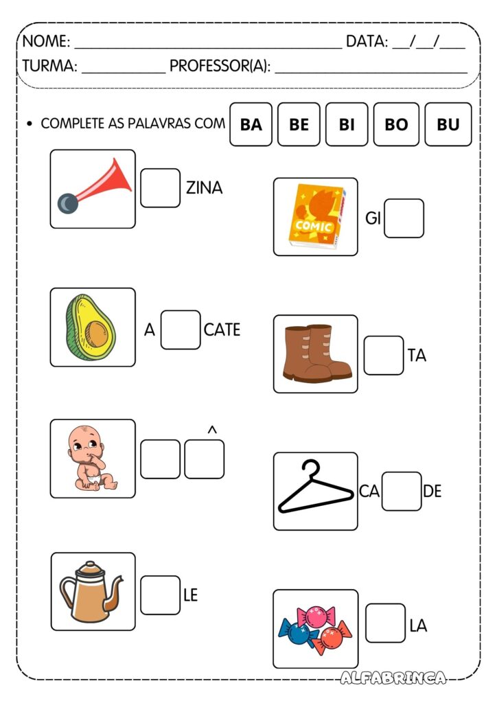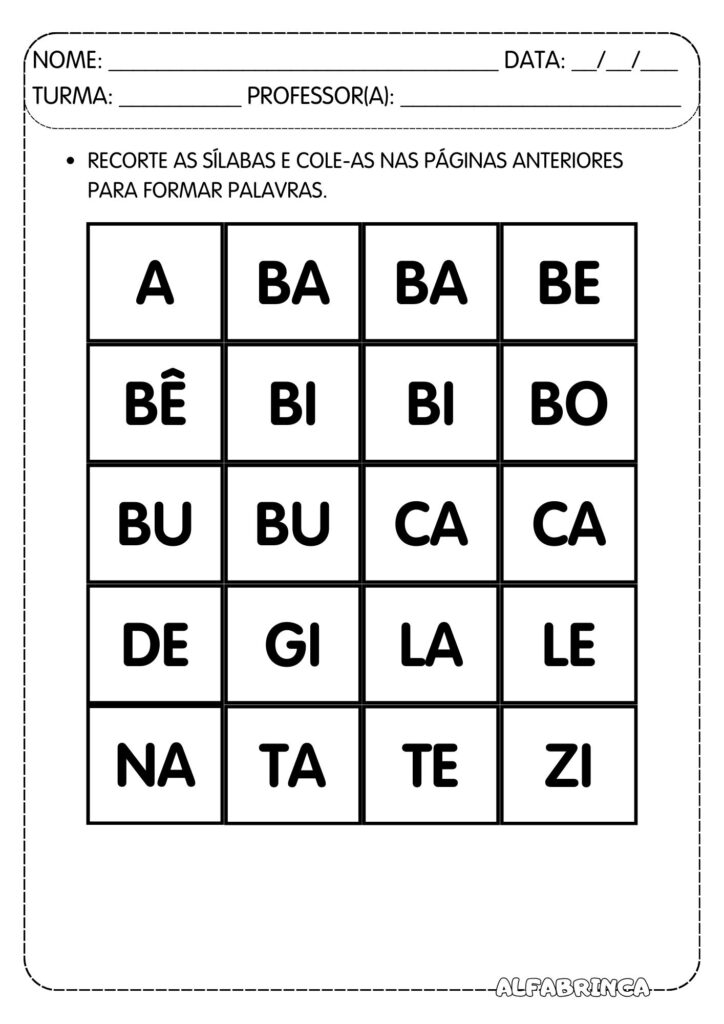- Dado com as sílabas complexas BA, BE, BI, BO e BU. A intenção é que os alunos recortem, colem e montem o dado e, depois, em duplas, pode-se orientar os alunos a jogar o dado e, a depender da sílaba na face do dado, devem dizer quantas palavras se lembrarem com a sílaba em questão, alternando a vez de cada um falar. Ao acabarem de dizer as palavras, jogam o dado novamente e dão continuidade ao jogo até falarem palavras com todas as sílabas no dado. Se caso cair na face que contém um ponto de interrogação, os alunos escolhem a sílaba complexa que quiserem.