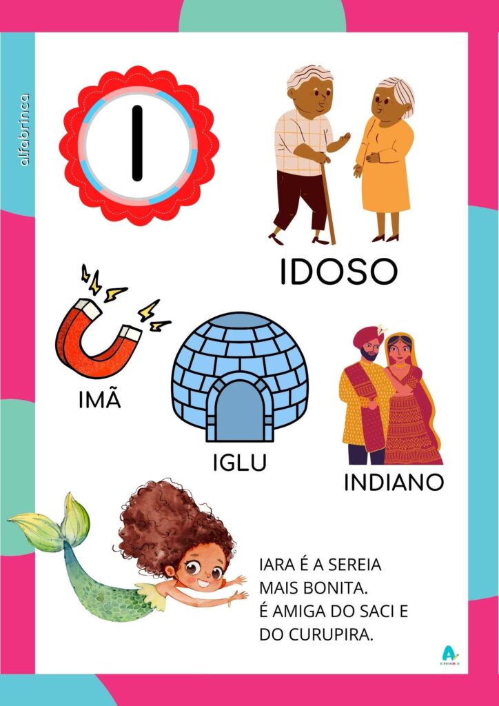 Cada página traz uma letra do alfabeto em destaque, acompanhada de palavras e imagens que começam com a letra trabalhada, ajudando a criança a relacionar som, escrita e significado.