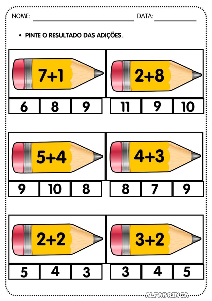 Cada lápis traz diferentes operações de adição para que a criança resolva, tornando o momento do cálculo mais atrativo e visual. O recurso pode ser usado em sala de aula, como lição de casa ou até em jogos matemáticos.